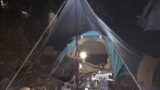 風除け兼荷物置き場兼子供の秘密基地となる「ワンタッチテント」をサッと設営。